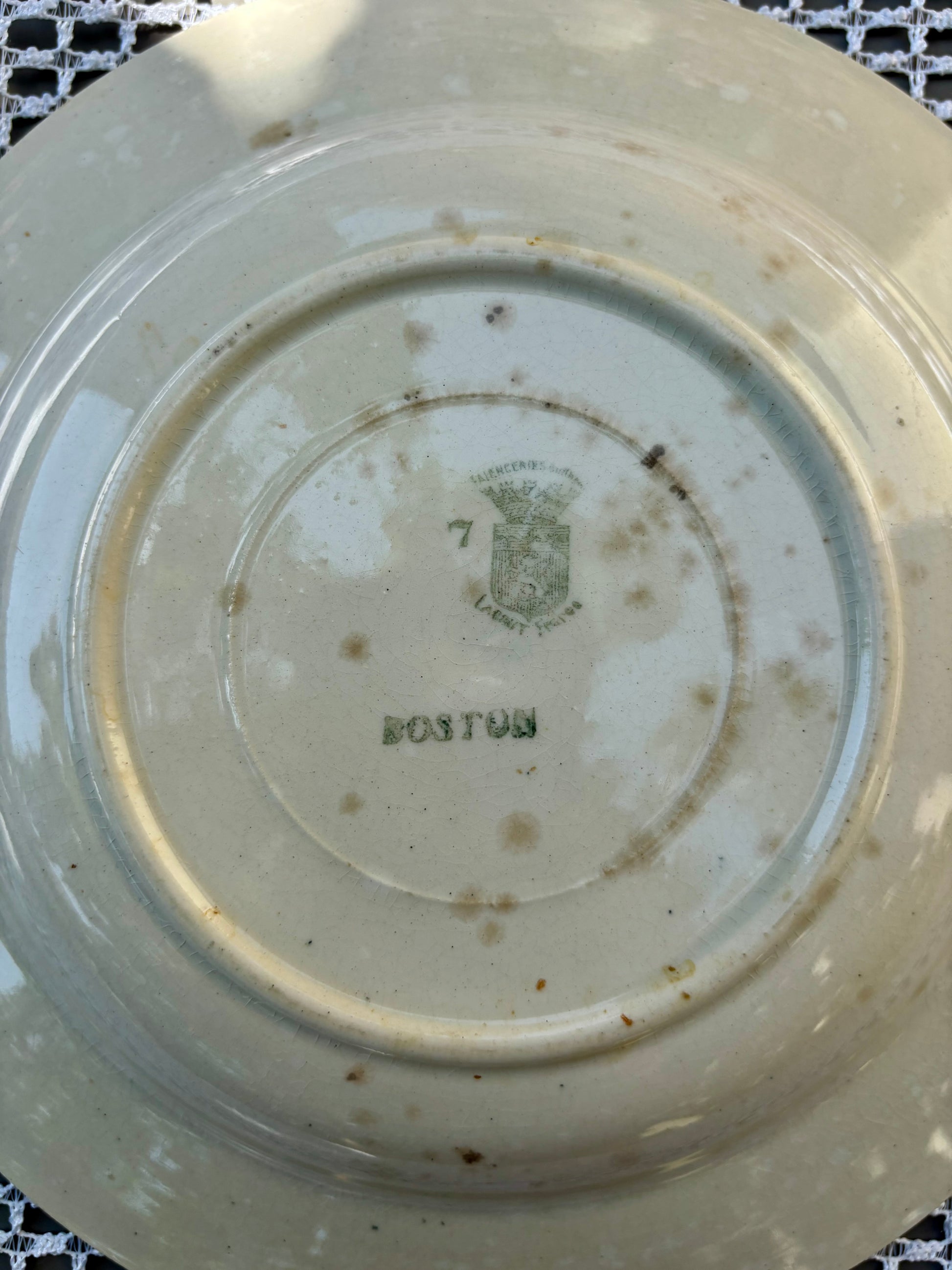 Assiette creuse de la manufacture des Frères Labrut, dans la Rhône, modèle Boston avec un décor floral et géométrique vert et orange