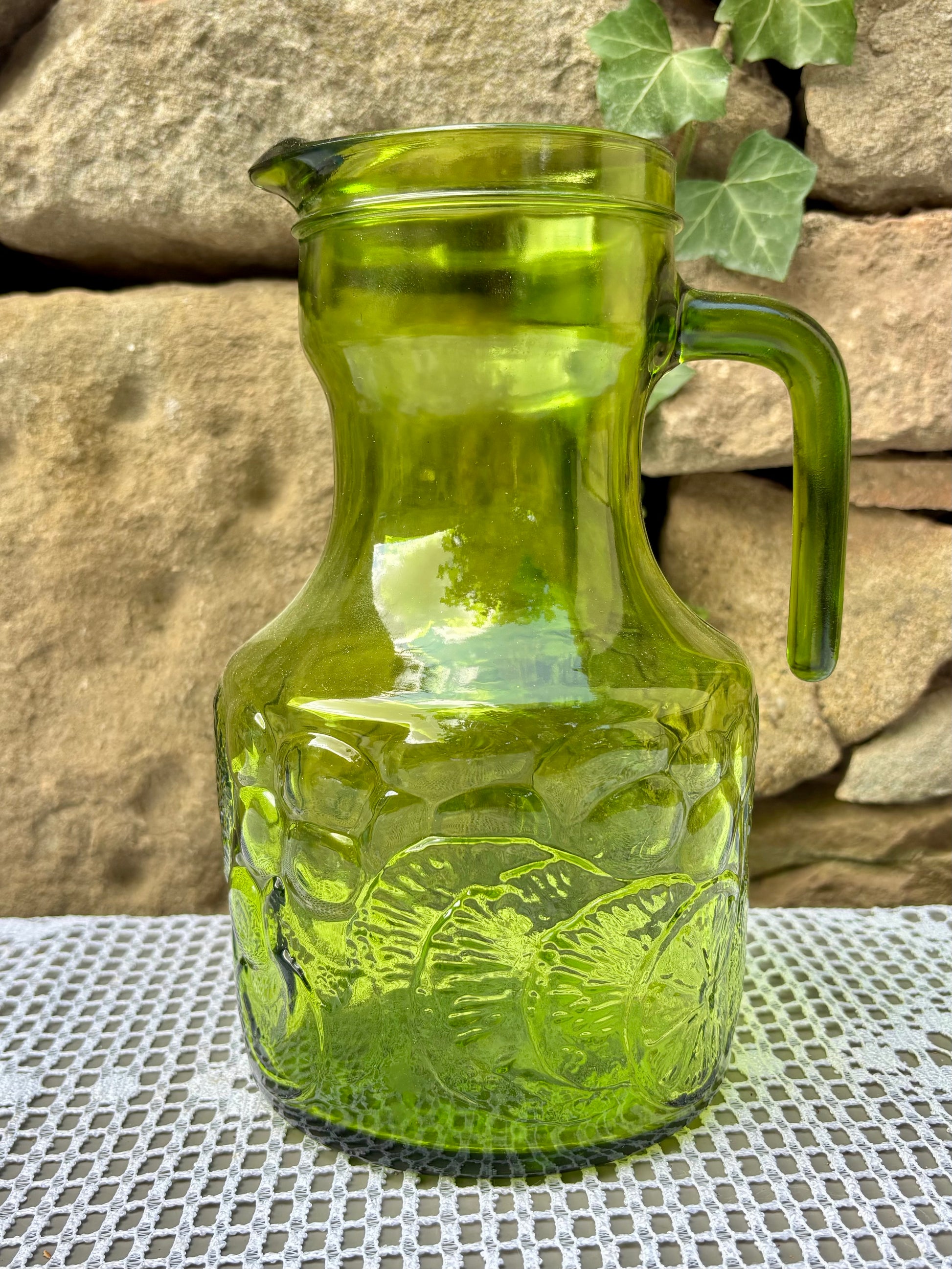 Pichet en verre vert, décor en relief représentant des fruits
